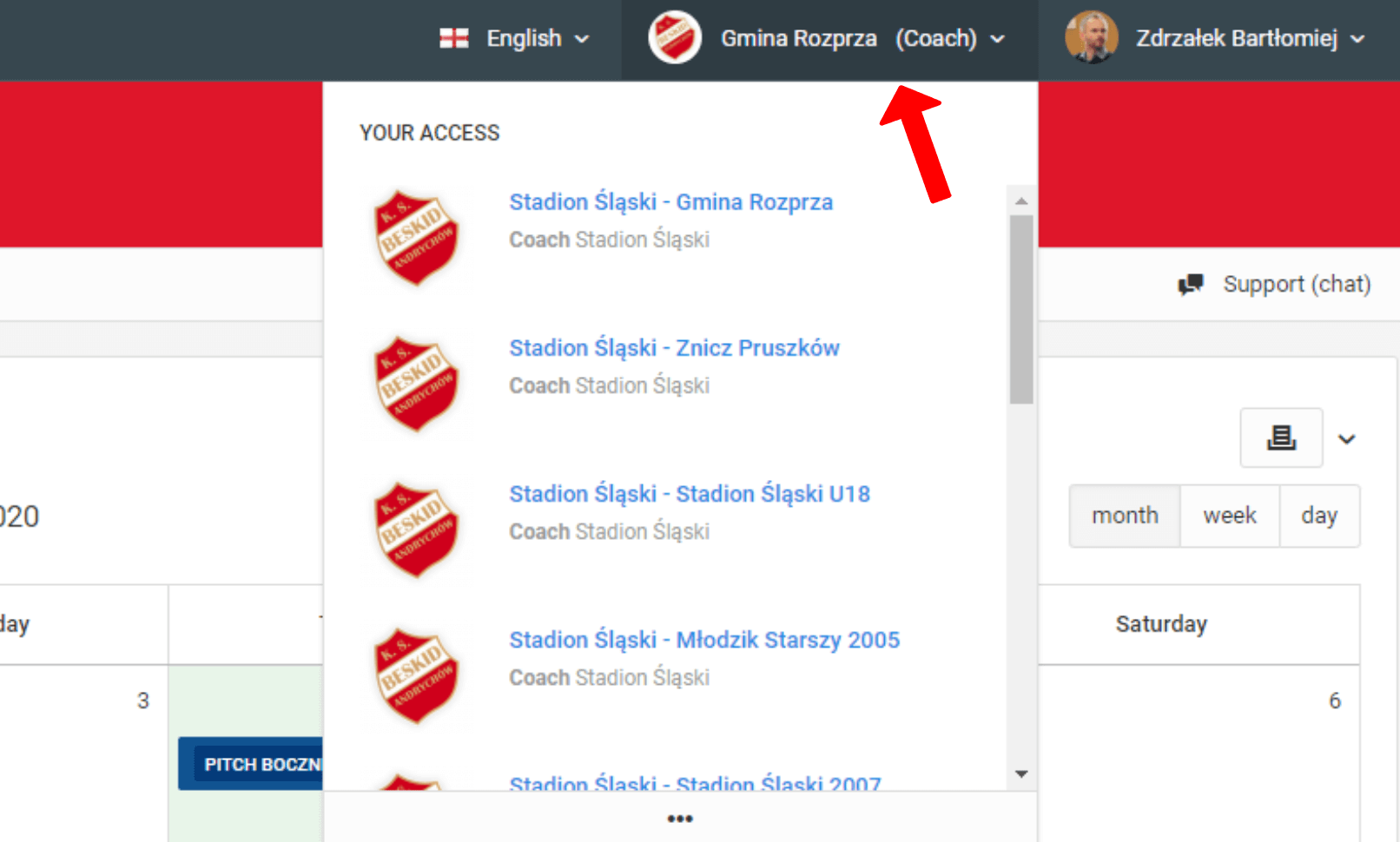 Systém vám umožňuje mít více než jednu roli. To znamená, že s jedním přihlašovacím jménem a heslem můžete systém používat jako: rodič, hráč, trenér, koordinátor nebo hlavní administrátor klubu. Pro přepínání mezi vašimi rolemi klikněte na tlačítko s vaší aktuálně načtenou rolí v pravém horním rohu. Dalším krokem je výběr role, kterou chcete načíst jako aktivní. Změna role může vést ke změně úrovně přístupu k systému. Podrobnější seznam rolí najdete v levém menu pod položkou "Přístupy".