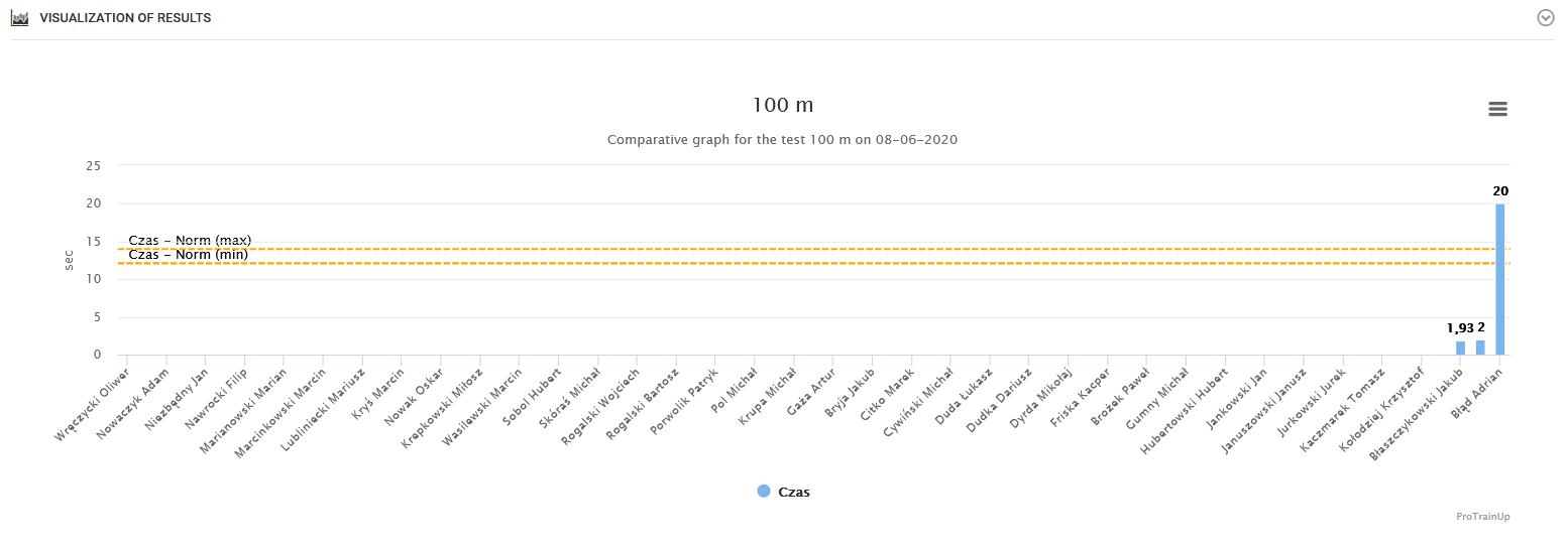 Das Ausfüllen von Testergebnissen generiert Berichte in Form von grafischen Diagrammen. Unter den Ergebnissen jedes Tests wird automatisch ein Ranking einer bestimmten Messung in Form eines Balkendiagramms erstellt. Darüber hinaus wird für jeden Teilnehmer separat die Historie der Messungen eines bestimmten Tests generiert. Diagramm, das die Historie der Ergebnisse eines bestimmten Spielers zeigt.