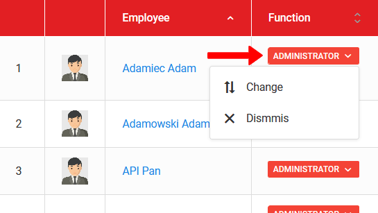 Για να διαγράψετε ή να αλλάξετε τον ρόλο ενός υπαλλήλου, κάντε κλικ στα χρωματιστά πλακίδια δίπλα στο όνομα του υπαλλήλου. Όταν κάνετε κλικ, θα δείτε δύο επιλογές για να διαλέξετε: "απόρριψη" ή "αλλαγή". Η απόρριψη σημαίνει ότι ο ρόλος αφαιρείται από τον χρήστη και κάνοντας κλικ στην αλλαγή, μπορείτε να επεξεργαστείτε τον τρέχοντα ρόλο. P >