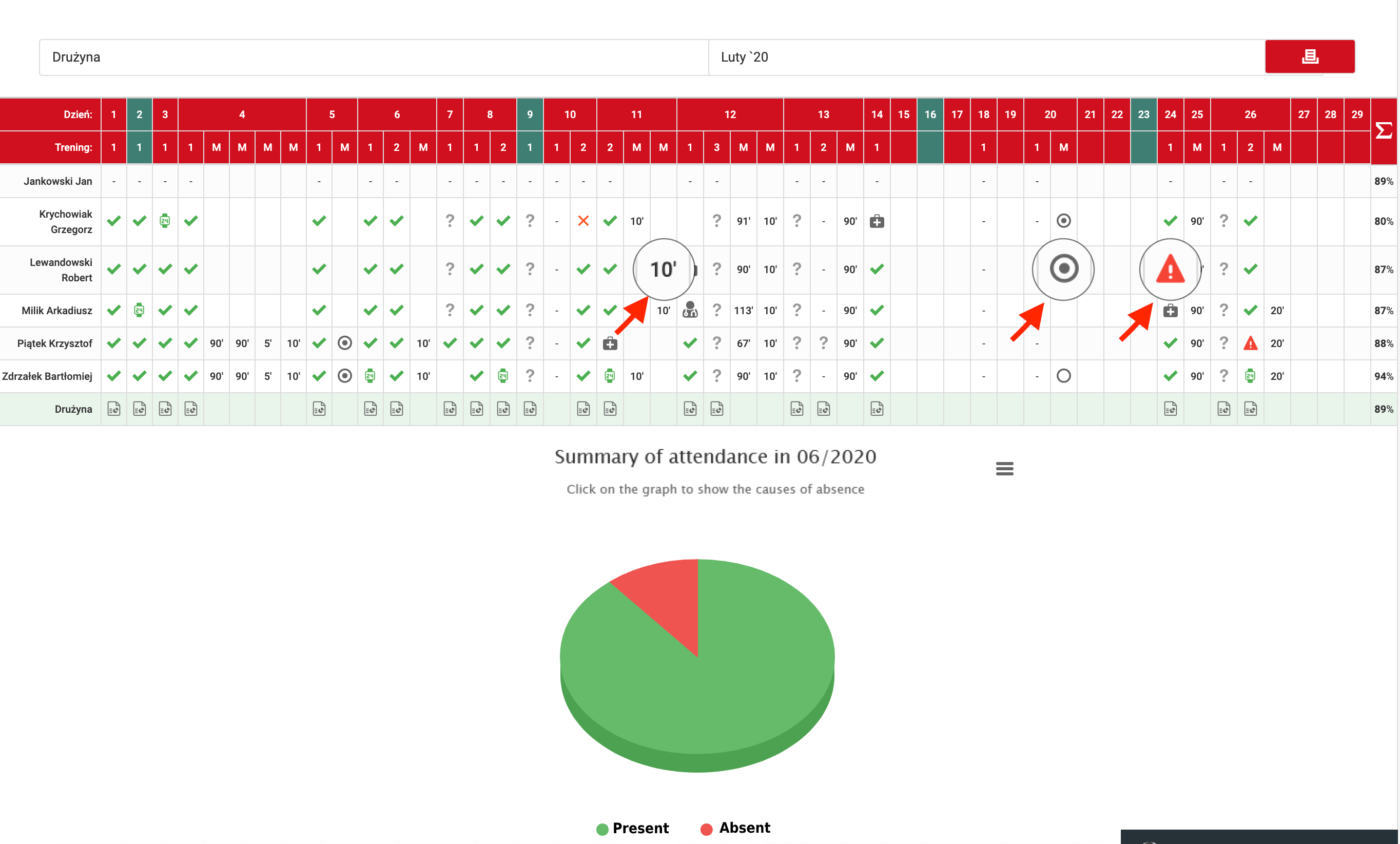 Below the table is a pie chart showing the attendance for the selected range of data, in the chosen month. It is worth noting that this graph is interactive. When you click on the red area, the chart will display detailed data about the reasons for the absence in training sessions.