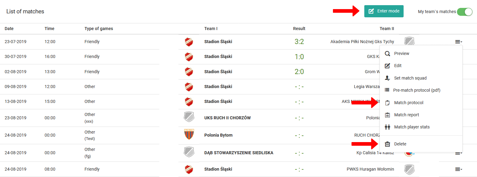 You have two options to complete the result. Basic and advanced. The first one is that you can only enter the score of the match. To enter it, click on the green button "enter mode". The second, advanced option will be available from the menu of the match (last column in the table). To go to the advanced completion of the match result, select the option "match protocol" from the menu.