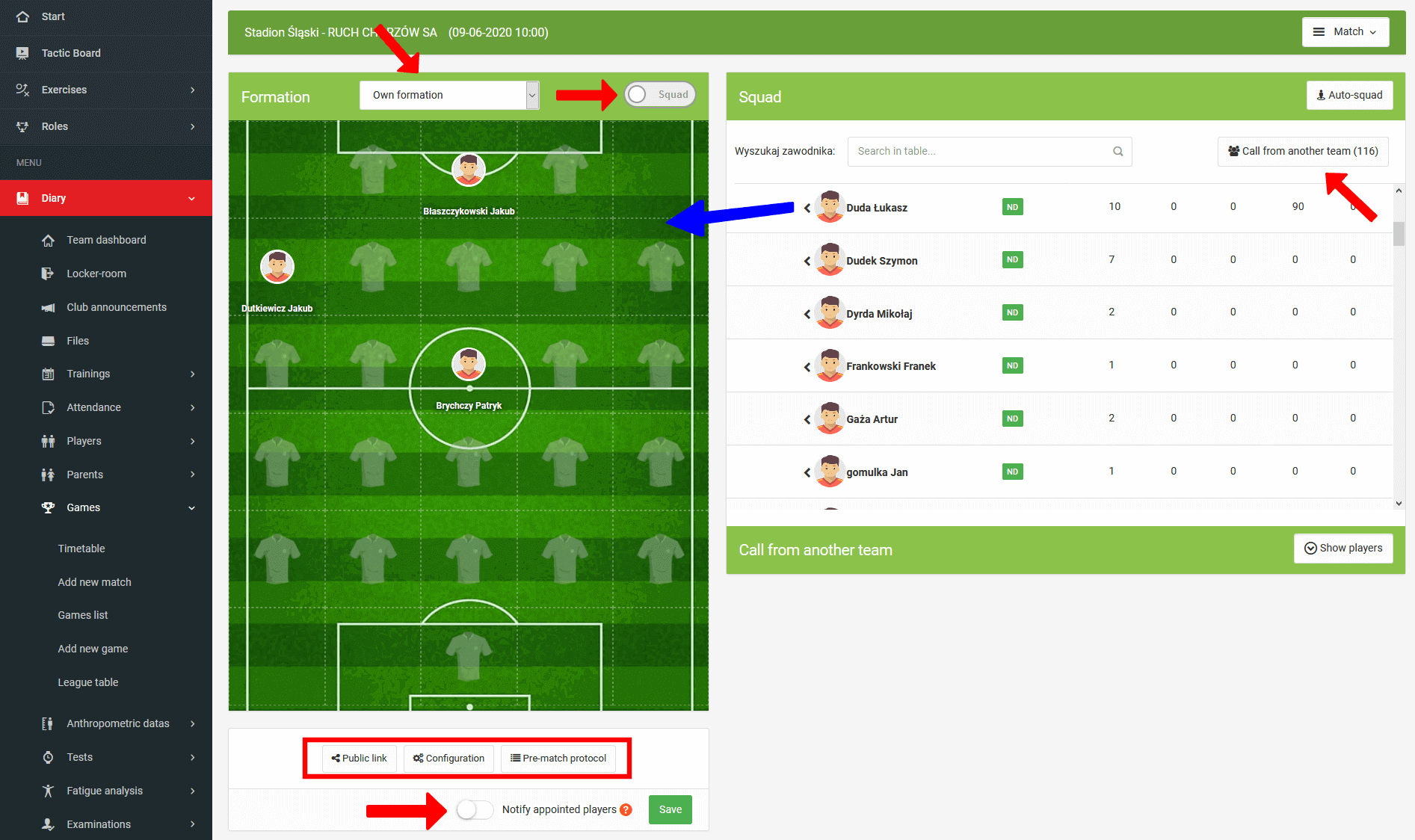 La ventana de alineación del partido, además de permitir elegir una alineación básica y un banquillo de suplentes, ofrece muchas opciones adicionales. La primera es la posibilidad de colocar una formación predefinida en el campo. El sistema también permite convocar jugadores de otros equipos. Para hacerlo, haz clic en el botón "convocar de otro equipo" y arrastra los jugadores seleccionados al campo.