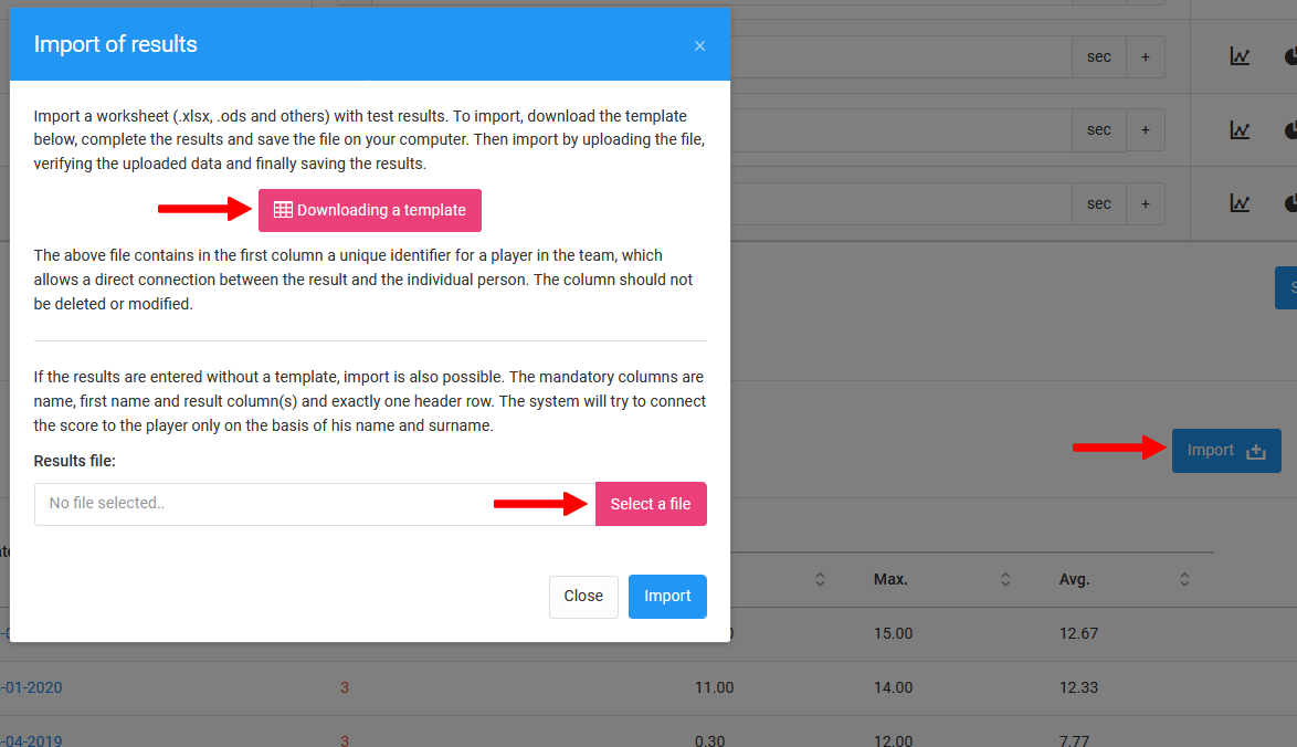 Sistēma ļauj ielādēt testa rezultātus no iepriekš sagatavota xls faila. Lai to izdarītu, noklikšķiniet uz zilās "importēt" ikonas testa rezultātu ievades logā. Noklikšķinot parādīsies logs, kur jūs varat lejupielādēt faila veidni vai ielādēt jau aizpildītu xls failu. Lai pārliecinātos, ka dati tiks labi nolasīti un piešķirti attiecīgajiem spēlētājiem, mēs iesakām izmantot veidnes xls failu.