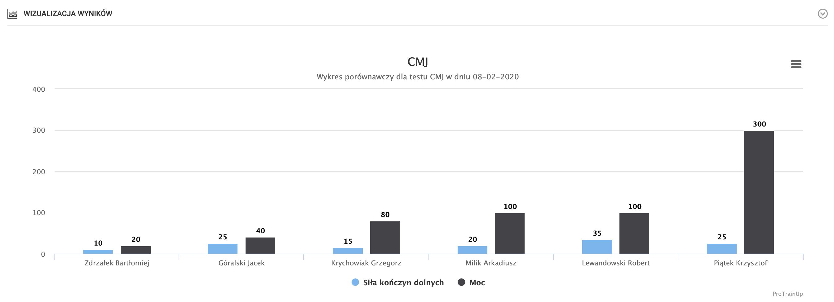 Uzupełnienia wyników testów skutkuje generowaniem zestawień w postaci wykresów graficznych. Pod wynikami każdego z testów, automatycznie tworzony jest ranking danego pomiaru w postaci wykresu słupkowego. Każdemu zawodnikowi z osobna generuje się również historia pomiarów danego, testu dla której tworzony jest wykres obrazujący historię wyników danego zawodnika.