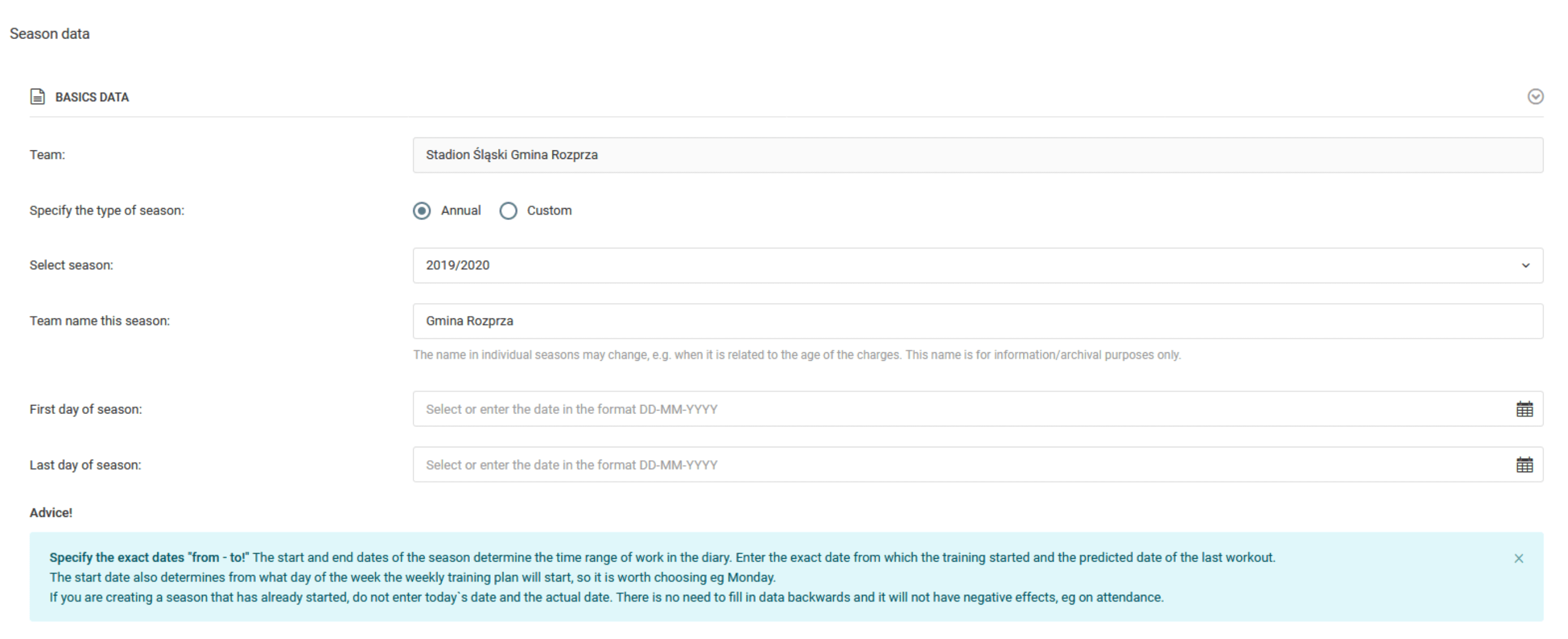 Чтобы создать сезон в системе, нажмите в левом меню дневник сезон добавить сезон. Откроется форма для создания нового сезона. Там вы найдете несколько полей для заполнения, начиная с выбора из списка сезона, например, 2020/2021, затем мы устанавливаем название нашей команды в этом сезоне и выбираем даты начала и окончания сезона. Мы рекомендуем создавать годовые сезоны, однако система позволяет добавлять более короткие сезоны, называемые нестандартными, в исключительных ситуациях.