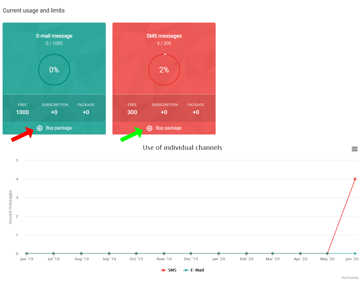 Odvisno od vaše klubske licence imate določen privzeti paket sms in e-poštnih sporočil v vaši članarini. Seveda po tem ko je osnovni paket sporočil zaključen, lahko kadarkoli kupite dodatni SMS ali e-poštni paket. Da to storite, vnesite levi meni v masovno pošiljanje sporočil statistika.