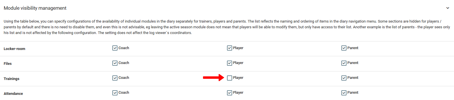 Іншим елементом налаштування, який впливає на значну частину системи, є модуль для приховування елементів щоденника для окремих груп користувачів. Щоб приховати або показати модуль вибраній групі користувачів, перейдіть у меню ліворуч до налаштувань club приховування модулів . Як ви можете бачити на малюнку нижче, управління видимістю модулів базується на виборі або скасуванні виділення вибраних елементів та функціональності щоденника. Знявши прапорець із даного елемента, він зникне з меню в облікових записах вибраної групи користувачів. У випадку, показаному на малюнку, гравцям заблоковано доступ до вкладки тренувань. Пам’ятайте, що ці налаштування застосовуються до всіх користувачів з певної групи в об’єкті, яким ви керуєте.